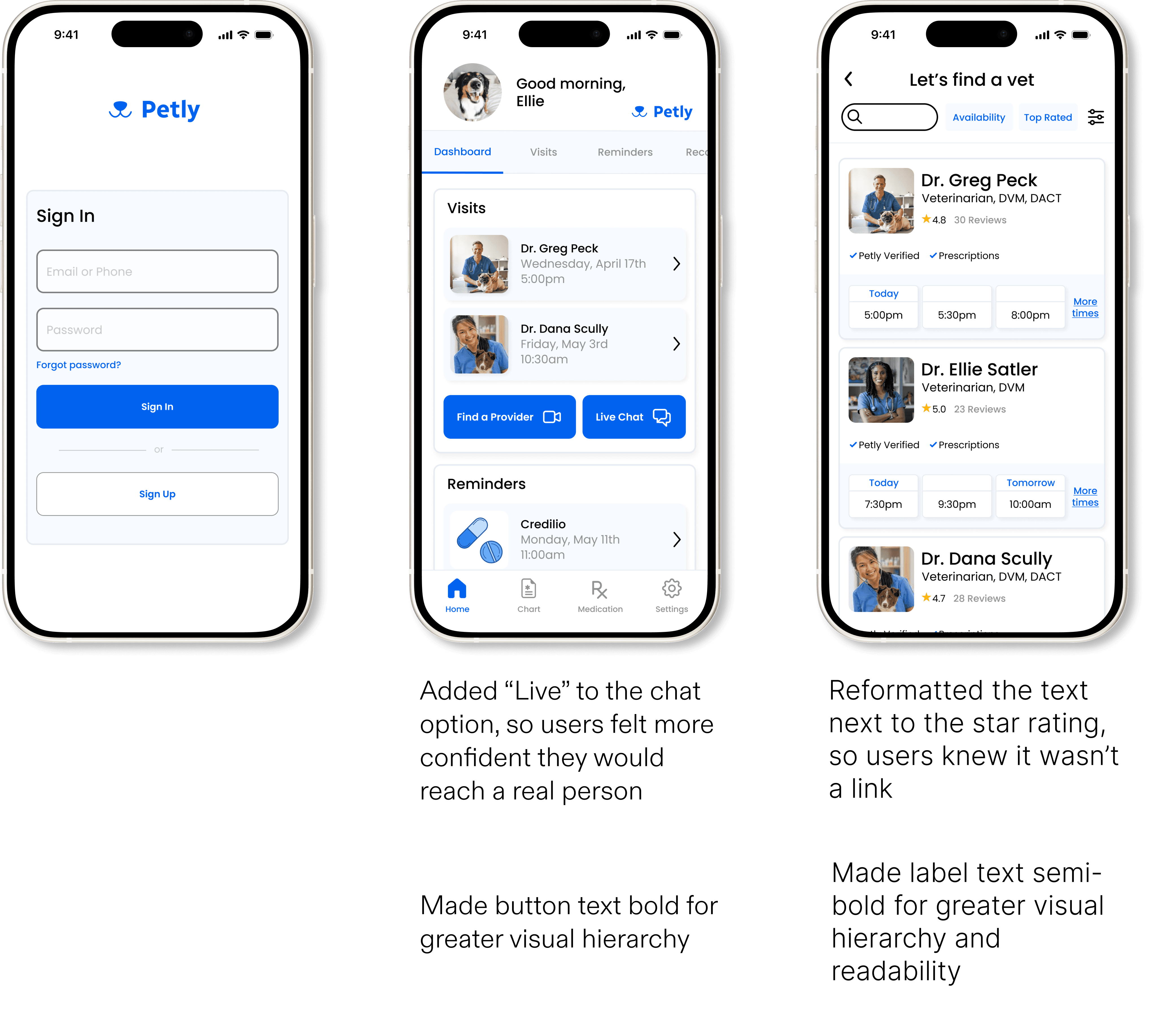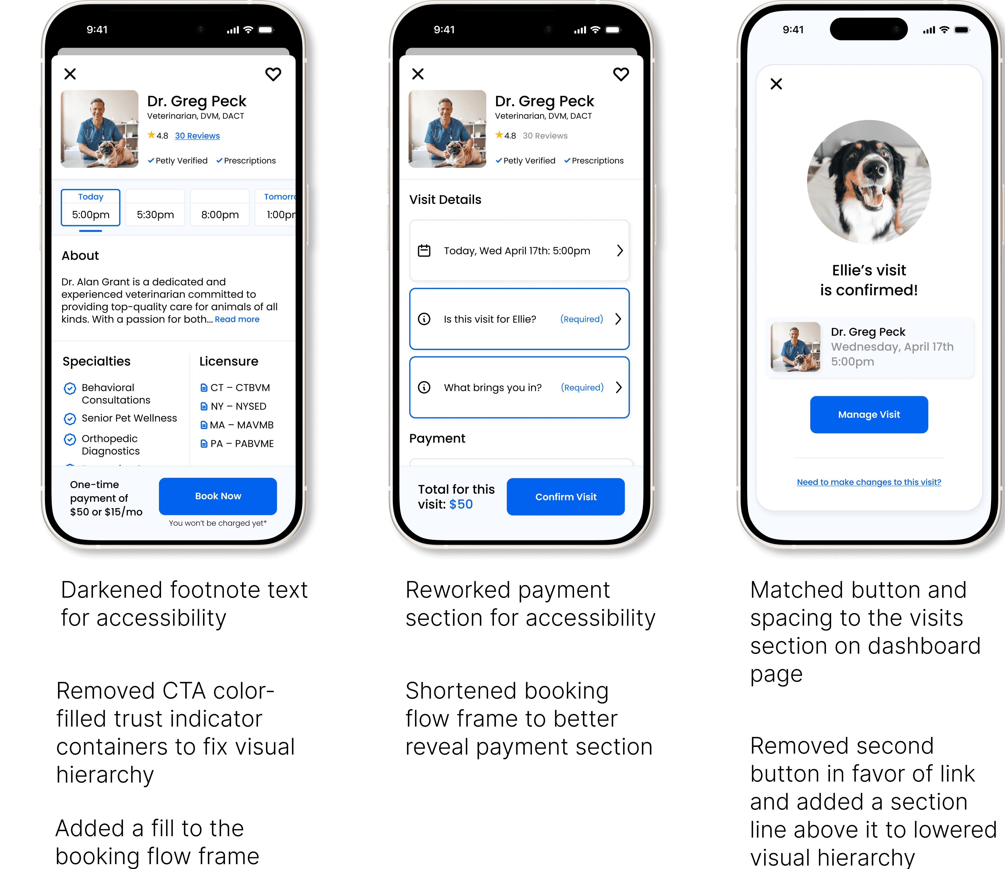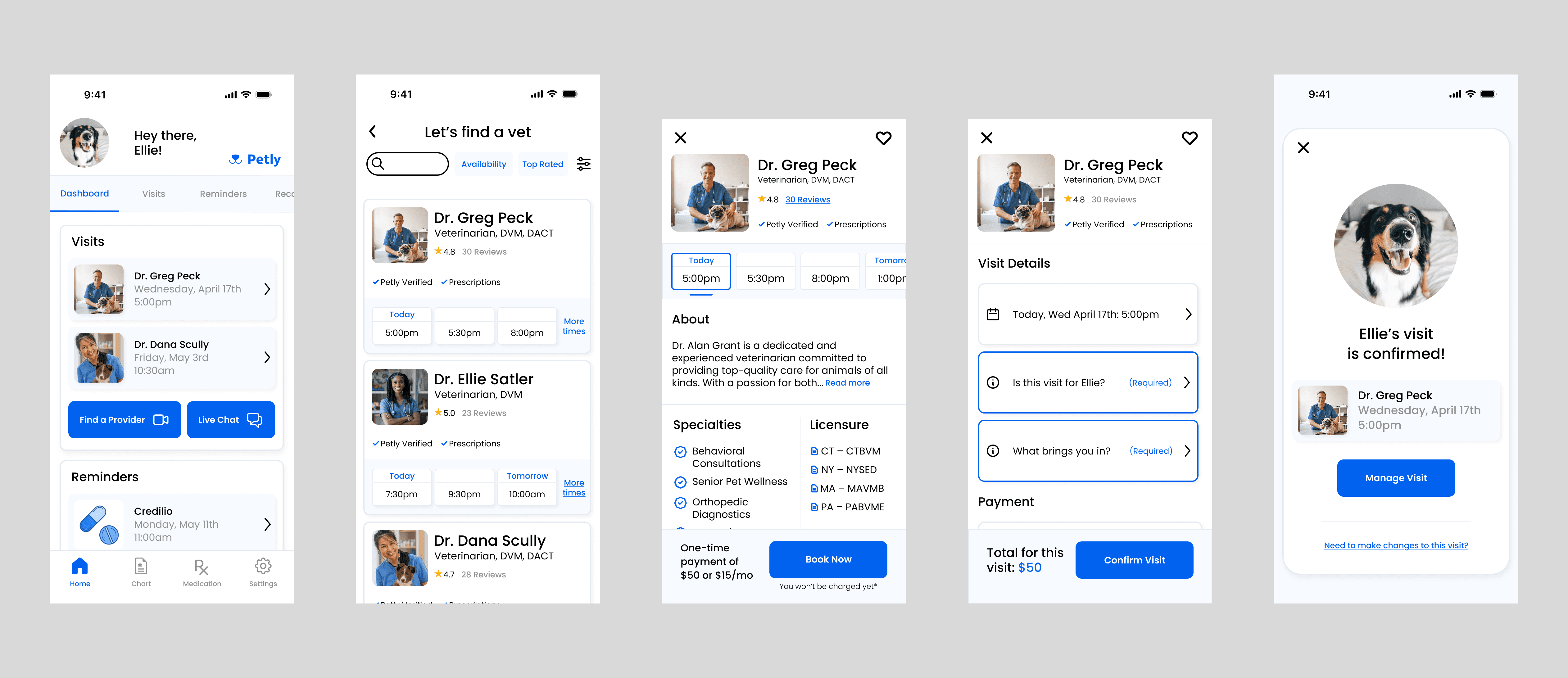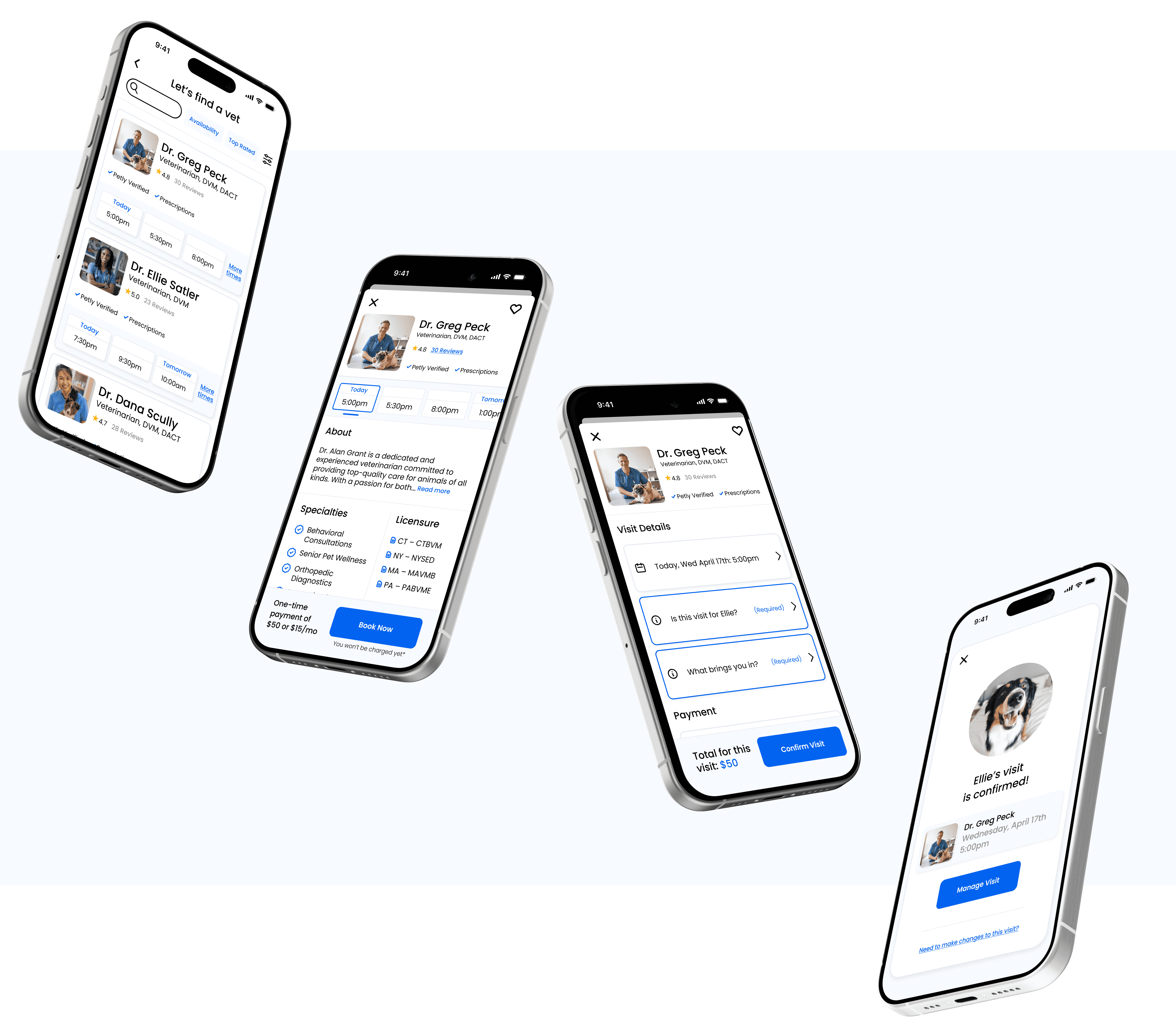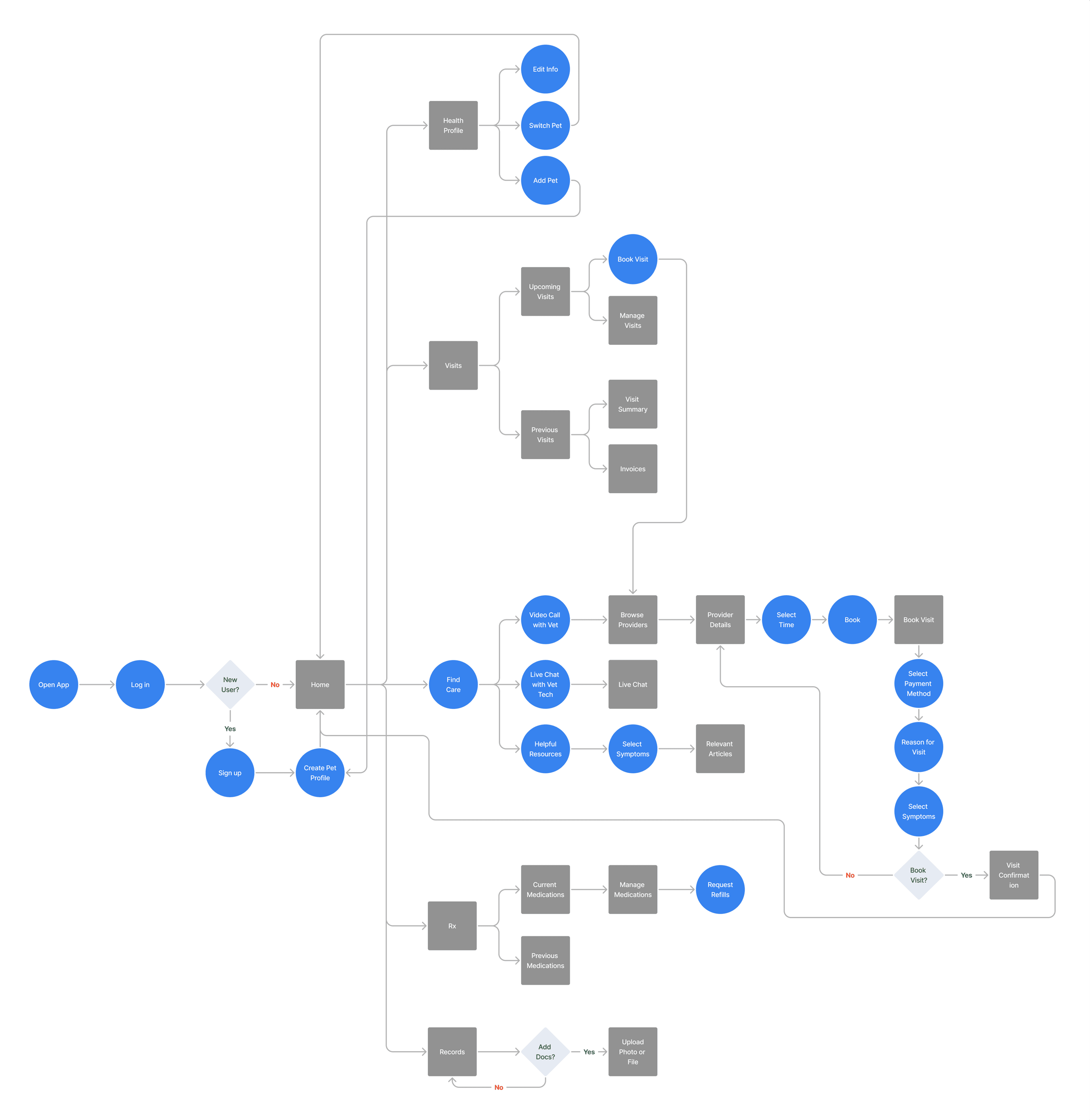 For familiarity and continuity, the flow is designed to mirror a conversation at a vet's office. Considerations like users' emotional states, goals, and urgency were pivotal in mapping out the journey. I wanted to make sure users were systematically guided through.